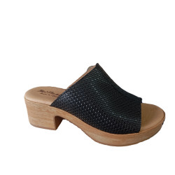 Leather sandal, upper with braided pattern, clog style, open at the toe, leather insole with gel.