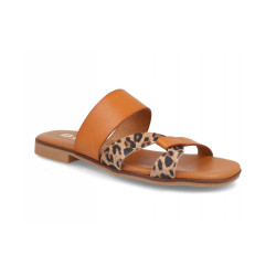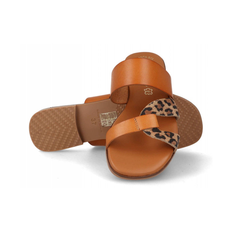 Sandalia de tiras de piel, con una tira con estampado de leopardo, plantilla de piel con gel.