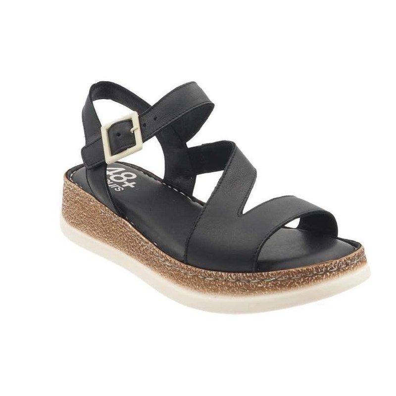 CALZADO Sandalia de piel negra, plantilla confort, suela antideslizante, cuña, marca 48 horas