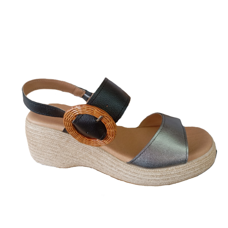Sandalia de tiras de piel, de tiras con cierre de hebilla, plantilla de piel con gel. Cuña de 8 cm de altura. Suela ancha,ligera, antideslizante. Realizada con piel muy suave.