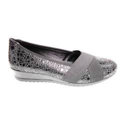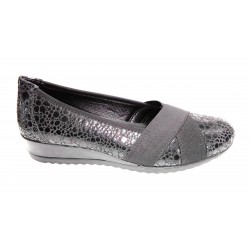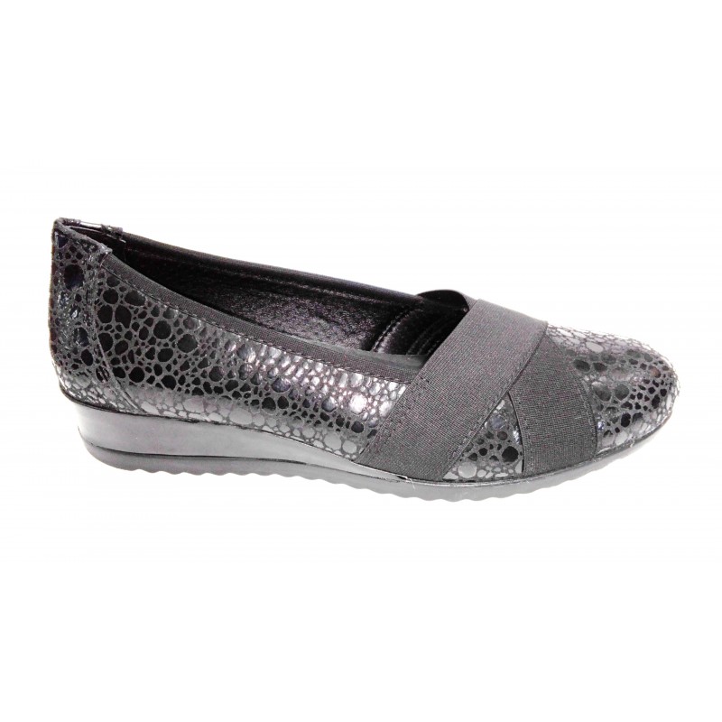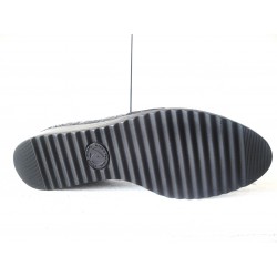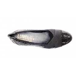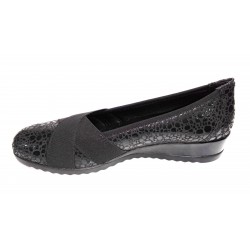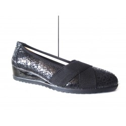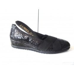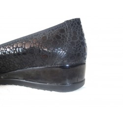 Zapato de piel grabada de color negro, con cuña de charol negro. Modelo de ancho especial, con plantilla extraíble.